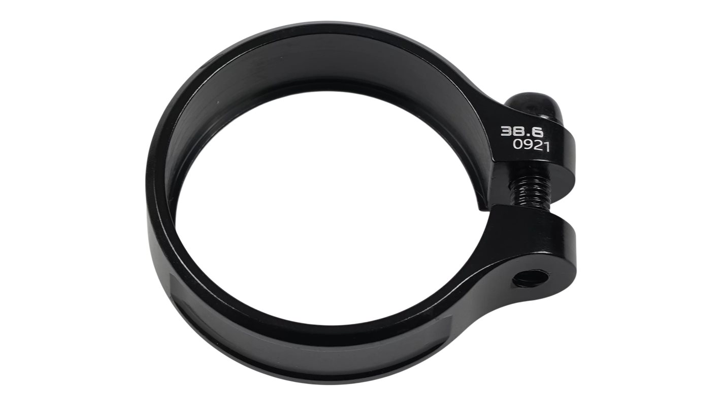 Lightweight round alloy seatpost collar with a 38.6mm internal diameter and steel bolt. Updated with a solid body collar for improved durability.